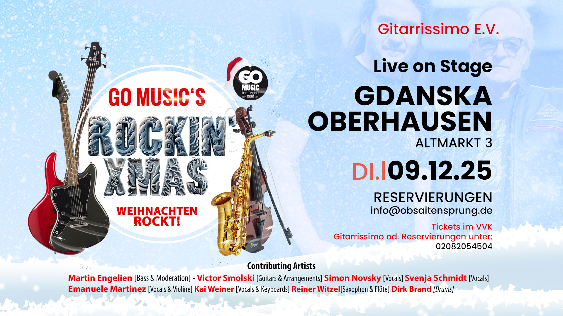 Gdanska Altmarkt 3, 46045 Oberhausen22.12.2025 Gitarrissimo 946 - Weihnachtsrock Superzeit Liebe Rockfreunde, seit 16 Jahren gibt es den Weihnachtsrock im Gdanska. Immer am 22. Dezember mit SUPERZEIT - und immer ist es ein Fest für alle, die die Hits der 60er und 70er Jahre lieben. Also, Karten reservieren, abrocken und Spaß haben. Weihnachtsrock ist Kult ! https://www.youtube.com/watch?v=Gcdf8NDDyx0&t=31s Montag, 22. Dezember 2025 Beginn: 20:15 Uhr Eintrittspreis: 18 € Restaurant »Gdanska« Altmarkt 3 46045 Oberhausen E-Mail: info@obsaitensprung.de