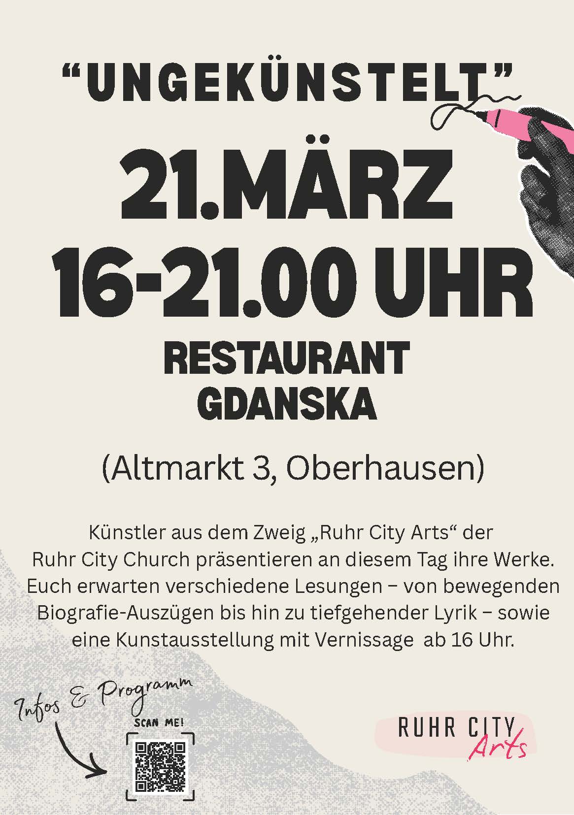 Gdanska Altmarkt 3, 46045 OberhausenKünstler aus dem Zweig „Ruhr City Arts“ der Ruhr City Church präsentieren an diesem Tag ihre Werke. Euch erwarten verschiedene Lesungen – von bewegenden Biografie-Auszügen bis hin zu tiefgehender Lyrik – sowie eine Kunstausstellung mit Vernissage ab 16 Uhr