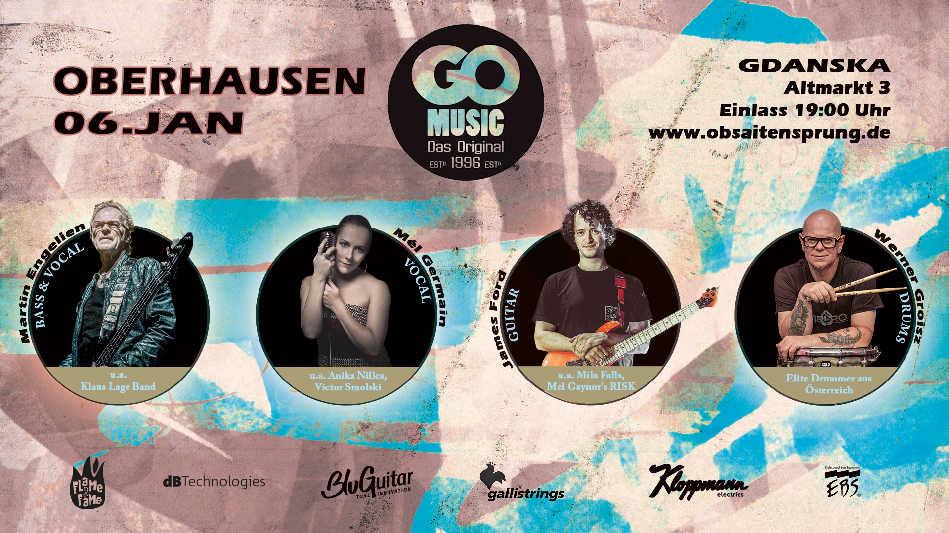 💥 GO MUSIC: Tourstart 2026! 💥 Live im Gdanska, Oberhausen 🗓️ Samstag, 06. Januar 2026 | ⏰ 20:00 Uhr GO MUSIC startet mit Vollgas – Neue Tour, neue Gesichter, pure Energie! Erleben Sie die explosive GO MUSIC Besetzung 2026 mit den fantastischen Neuzugängen: Mél Germain (Kanada) – Rock, Funk & Soul: Eine Stimme wie Feuer! James Ford (UK) – Der perlig-quirlige Gitarrenmagier. Werner Groisz (AT) – Weltklasse-Drumming mit Groove und Punch. Zusammengestellt von Mastermind und Bass-Legende: Martin Engelien Unvorherhörbar. Unwiederholbar. GO MUSIC eben.